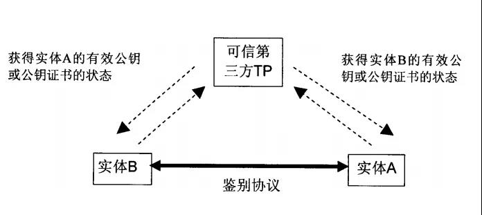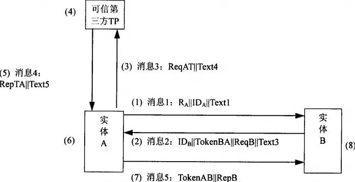 简单地讲,第一、二步,A和B交互身份。第三步,A向可信第三方TP请求鉴别A和B的身份并返回鉴别结果;第四步,可信第三方TP向A返回对A的身份鉴别结果和对B的身份鉴别结果。A完成对B的鉴别。第五步,A向B转发TP对A的鉴别结果,B完成对A的鉴别。A和B的身份可以为它们的数字证书或数字证书标识。在这个过程里,还采用随机数和签名的方式来保证鉴别过程的安全性。