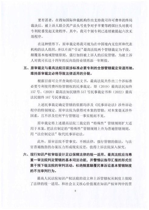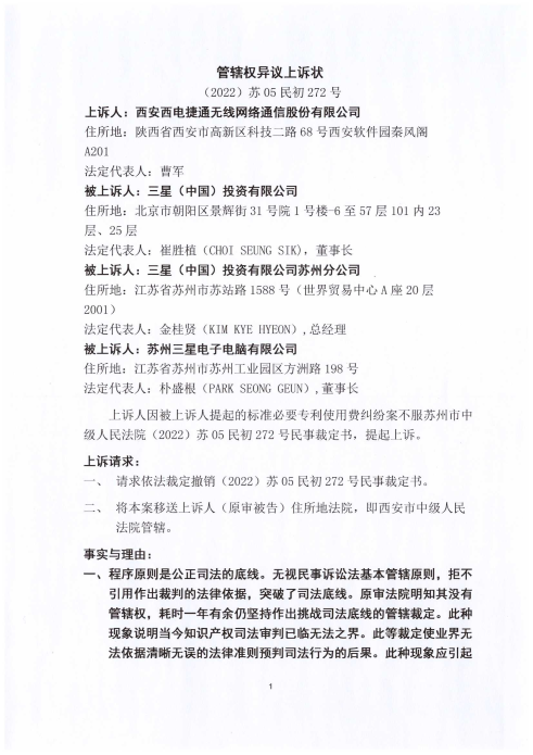 点击阅读 三星诉西电捷通标准必要专利使用费案司法文书(2022)苏05民初272号、(2024)最高法知民辖终229号